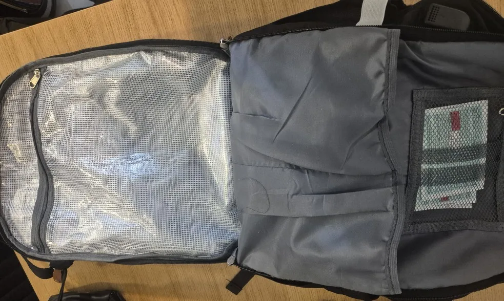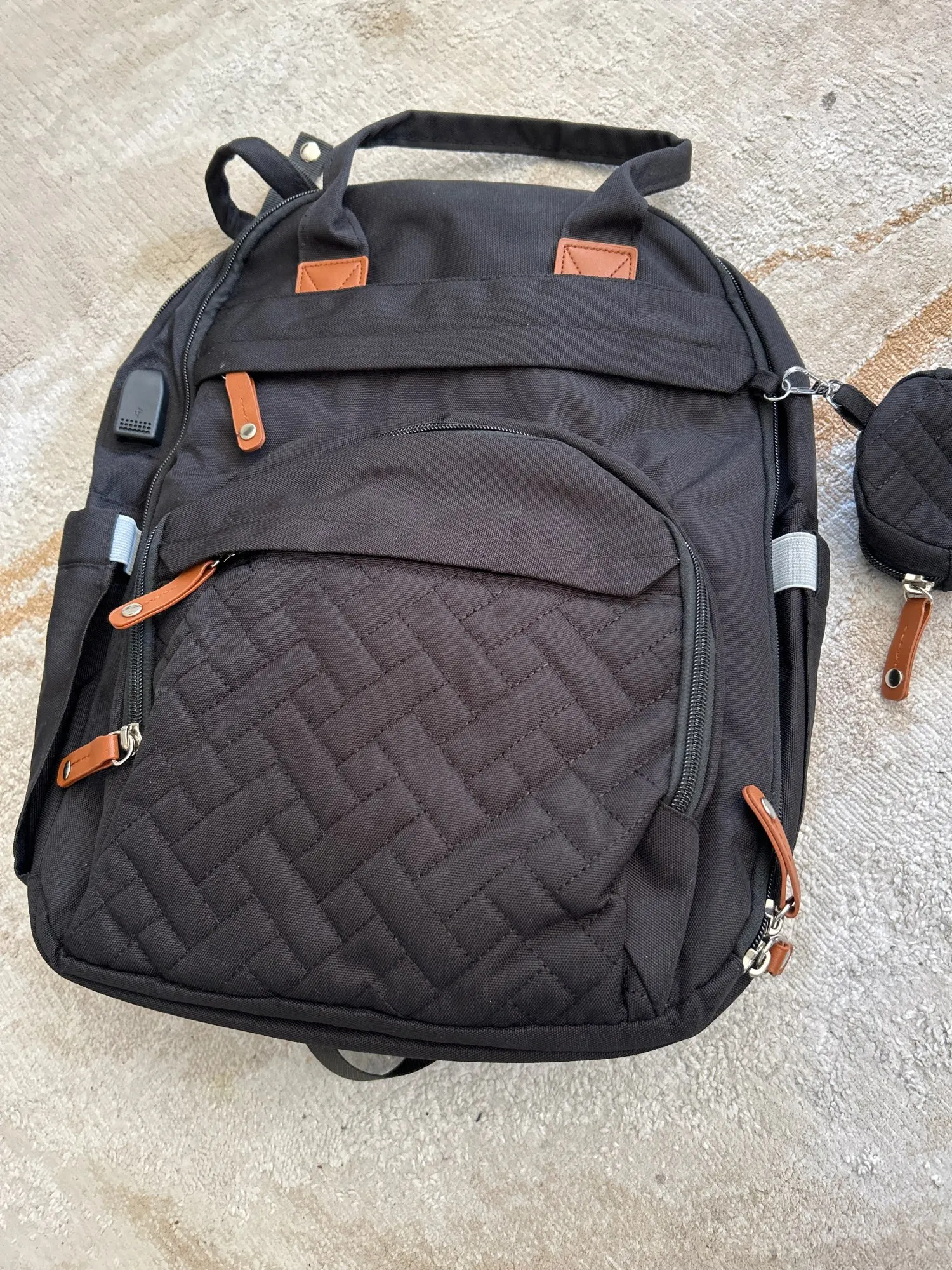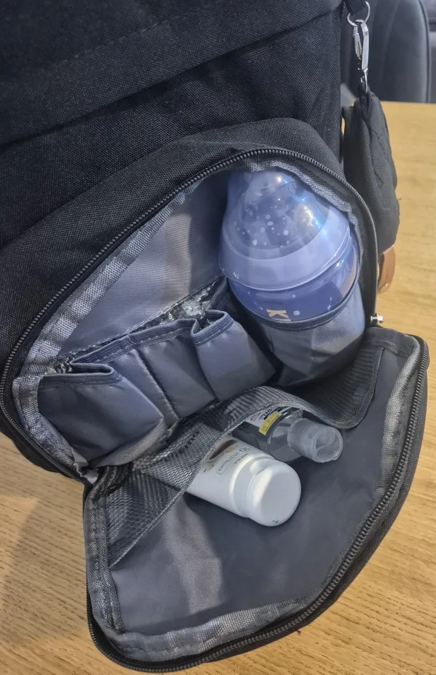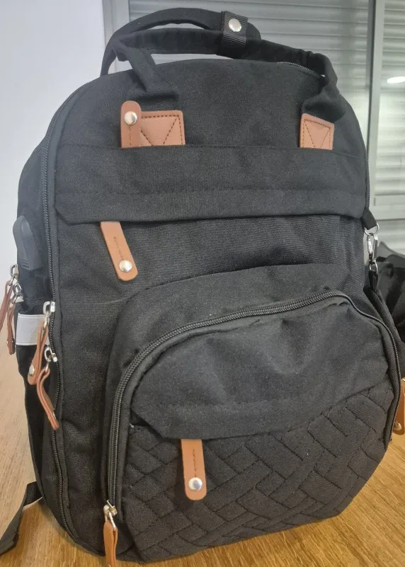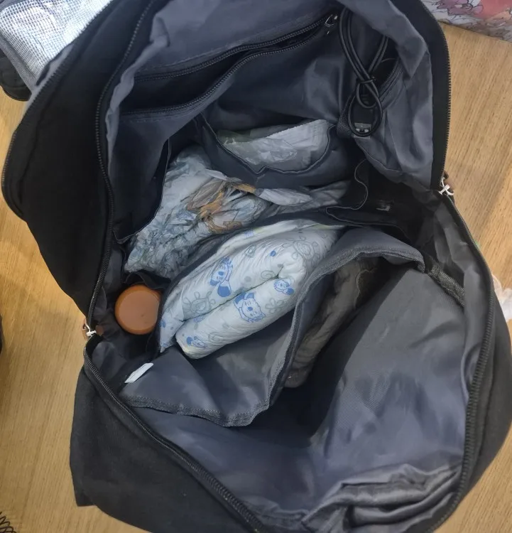 Contains many cells for storage, you can put a lot of things in it. It is very comfortable and useful for baby things as well as personal things. The delivery was very fast, highly recommended! 😀